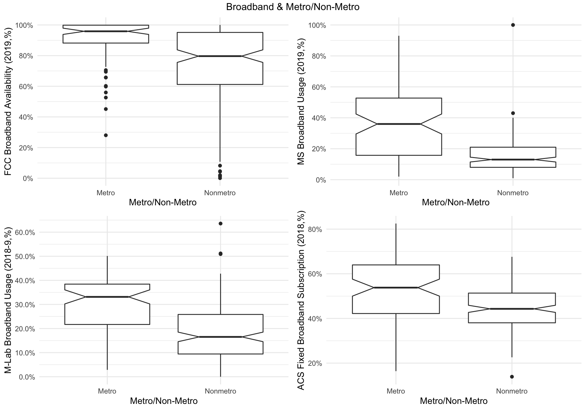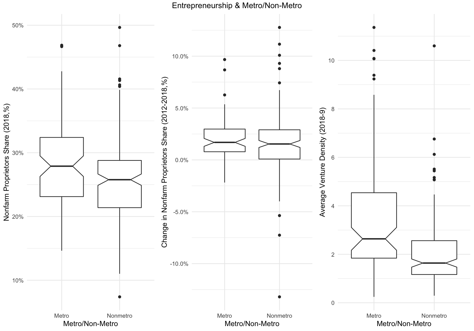 Using boxplots, we will inspect the relationships between the metro/non-metro factor and our major dependent and independent variables.