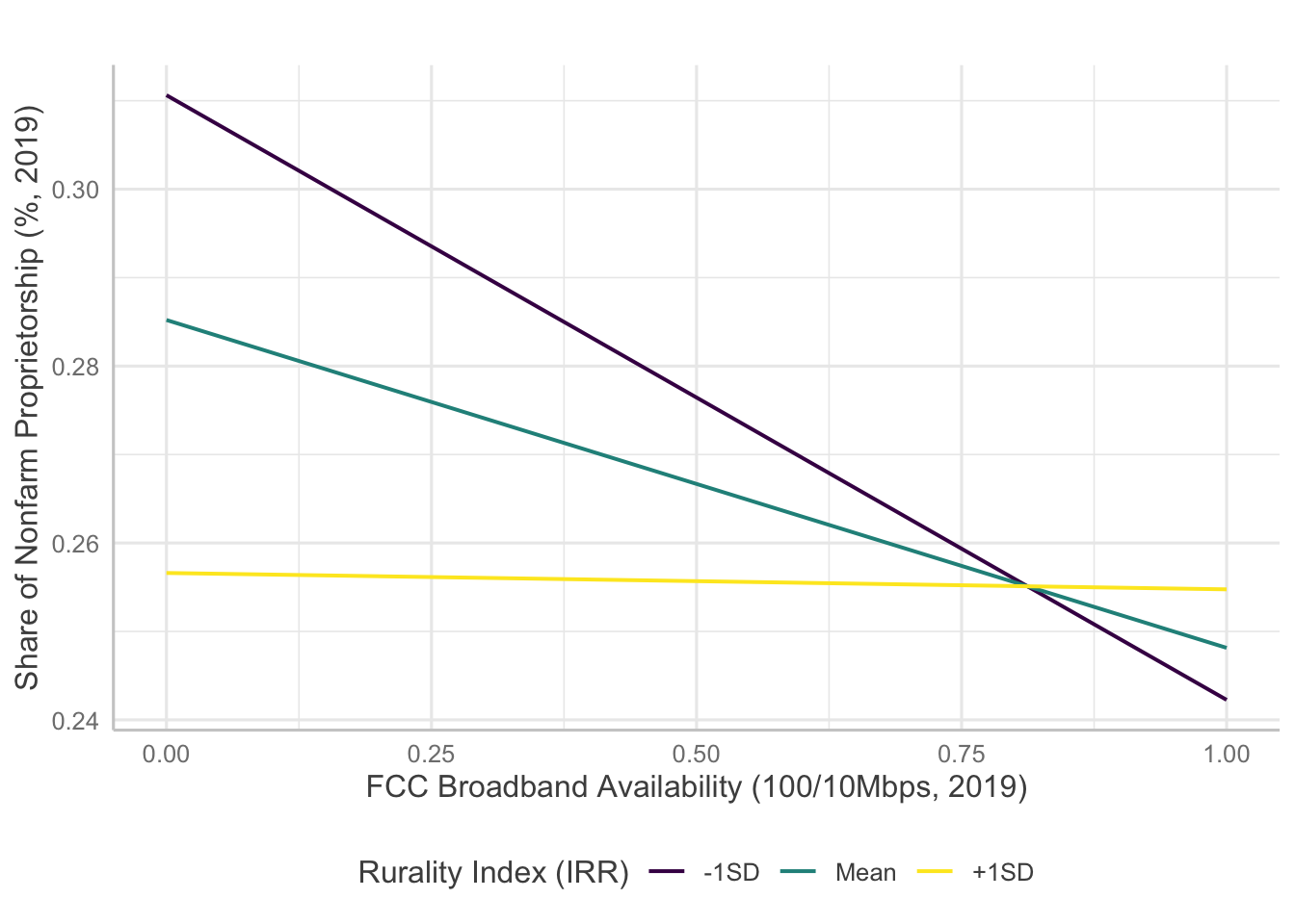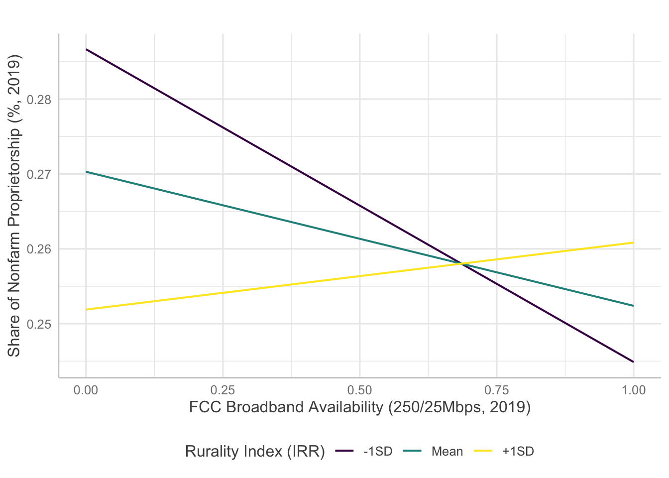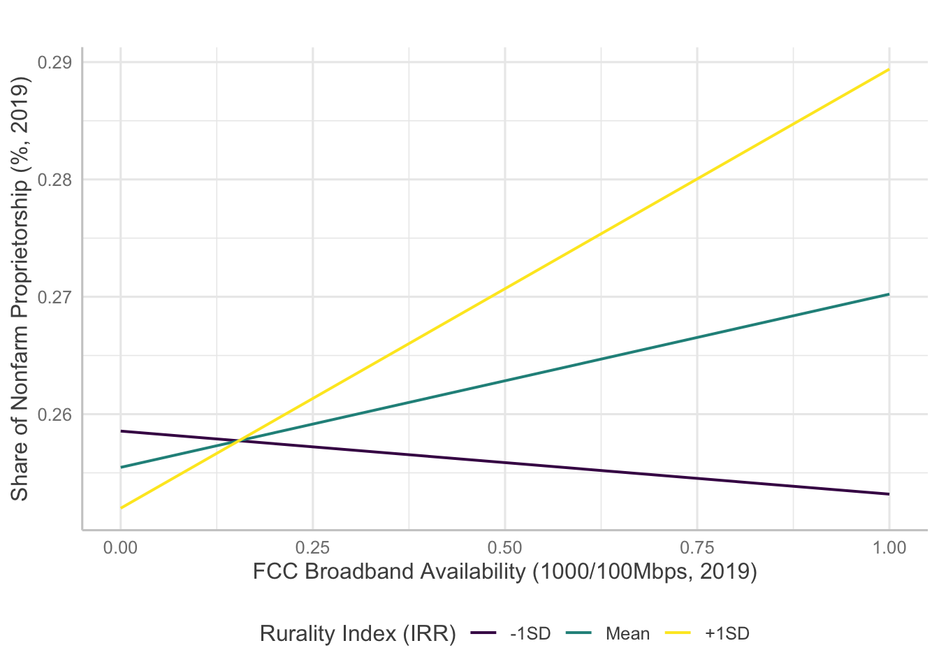 Several models indicate statistically significant interaction effects happening between broadband and rurality. Here, I will examine how the significant interaction terms predict entrepreneurship measures.