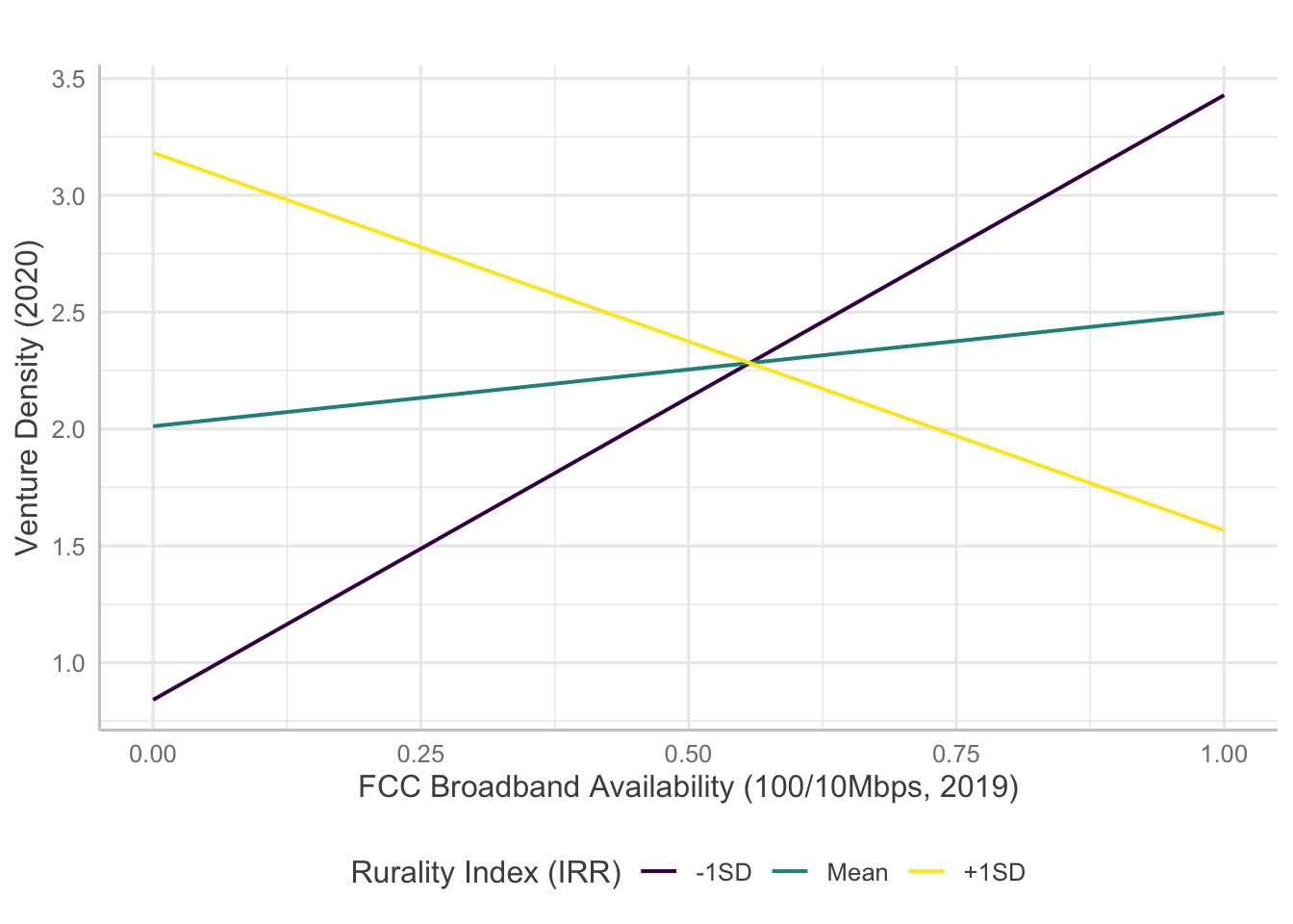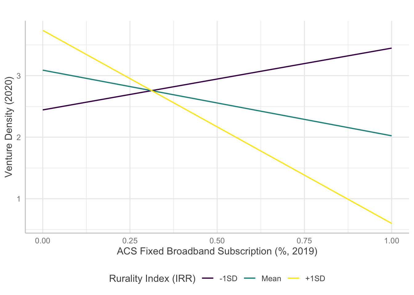 For venture density, broadband measures except availability of 1000/100 Mbps level broadband showed significant interaction with rurality. However, the results are confounding as the direction of the effects are opposite to initial hypotheses.